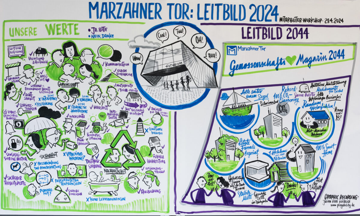 Der Leitbildprozess der Marzahner Tor eG war kein theoretisches Papierprojekt, sondern ein praktisch gelebter Veränderungsprozess, der alle Ebenen der Genossenschaft miteinander verbunden hat. Ausgangspunkt waren Gespräche mit Vorstand, Aufsichtsrat, Vertreter:innen, Mitarbeitenden und Mitgliedern, um zu verstehen, wie unterschiedlich Werte im Alltag wahrgenommen und gelebt werden.